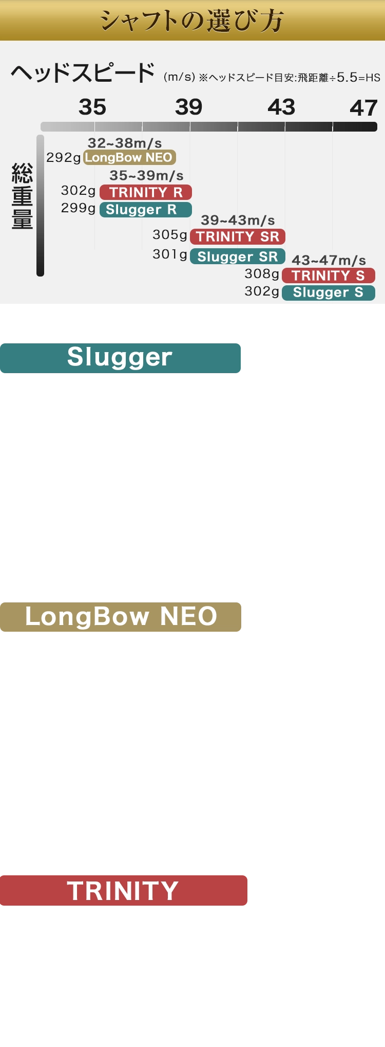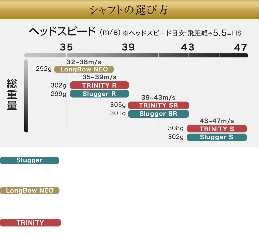 TRINITYのシャフトフレックスはR/SR/Sからお選びください。