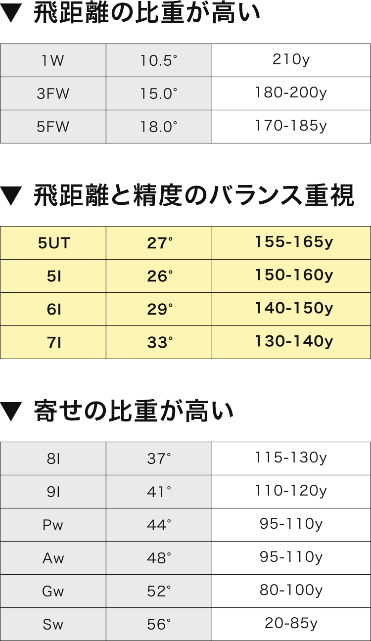それぞれの距離に適したアイアン、ユーティリティ、