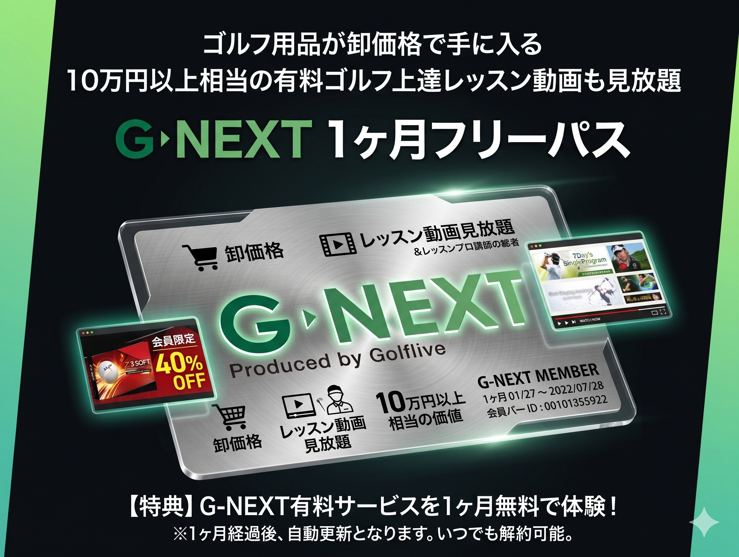同時に、ゴルフライブが運営する「G-NEXT」会員サービスの無料トライアル権を1ヶ月分(翌月20日まで)プレゼントします。